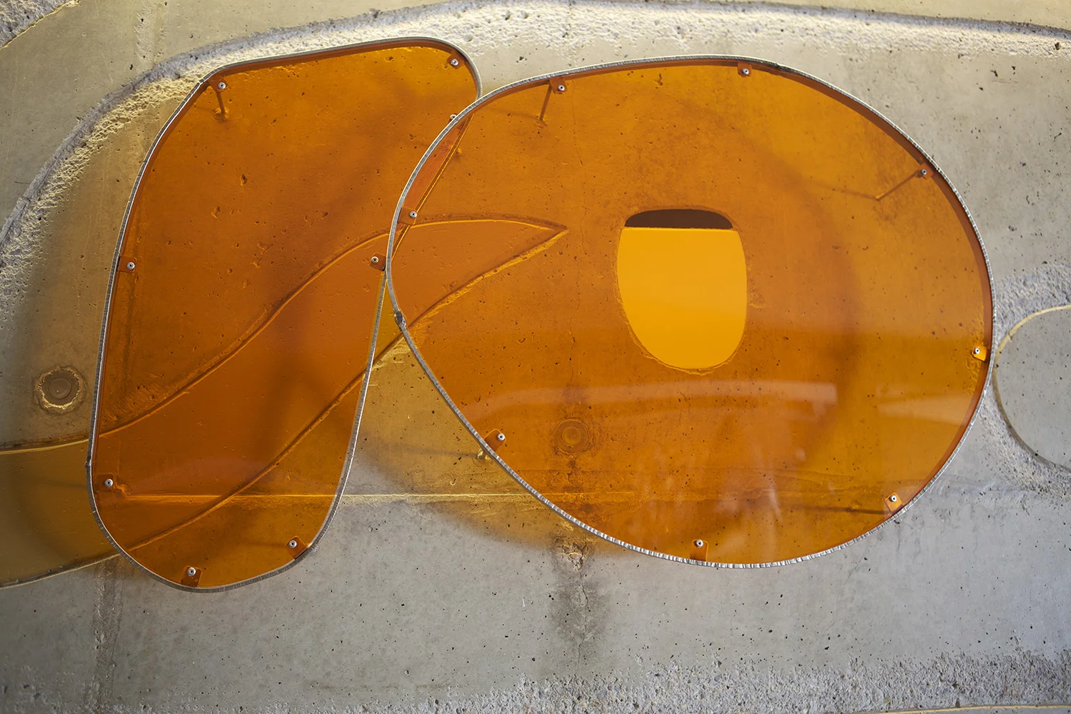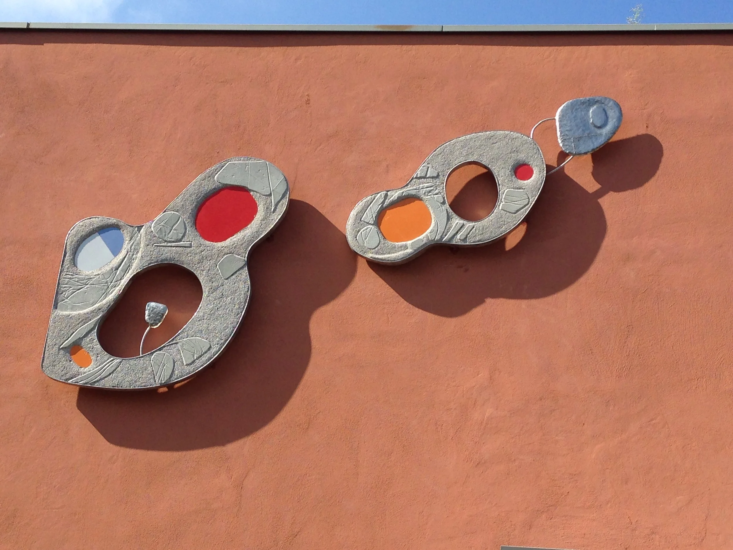 Aquests murals se cisellen directament sobre el formigó armat amb superposició d’aplics i encast de gres de colors.